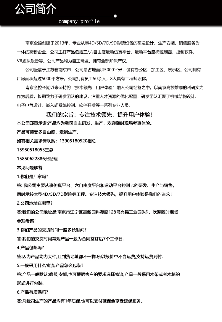 在艦艇仿真這一領(lǐng)域,南京全控航空科技有限公司是國(guó)內(nèi)首屈一指的行業(yè)專(zhuān)家,專(zhuān)業(yè)從事三/六自由度運(yùn)動(dòng)仿真平臺(tái)的開(kāi)發(fā),賽車(chē)/飛行游戲平臺(tái)、地震仿真平臺(tái)等。旗下的六自由度運(yùn)動(dòng)平臺(tái)是由六支電動(dòng)缸,上、下各六只萬(wàn)向鉸鏈和上、下兩個(gè)平臺(tái)組成,下平臺(tái)固定在基礎(chǔ)上,借助六支電動(dòng)缸的伸縮運(yùn)動(dòng),完成上平臺(tái)在空間六個(gè)自由度的運(yùn)動(dòng),從而可以模擬出各種空間運(yùn)動(dòng)姿態(tài)。六自由度運(yùn)動(dòng)平臺(tái)涉及到機(jī)械、液壓、電氣、控制、計(jì)算機(jī)、傳感器,空間運(yùn)動(dòng)數(shù)學(xué)模型、實(shí)時(shí)信號(hào)傳輸處理等一系列高科技領(lǐng)域,因此六自由度運(yùn)動(dòng)平臺(tái)是控制領(lǐng)域水平的標(biāo)志性象征。主要包括平臺(tái)的空間運(yùn)動(dòng)機(jī)構(gòu)、空間運(yùn)動(dòng)模型、液壓系統(tǒng)、控制系統(tǒng)。可廣泛應(yīng)用到各種訓(xùn)練模擬器,如艦艇模擬器等。