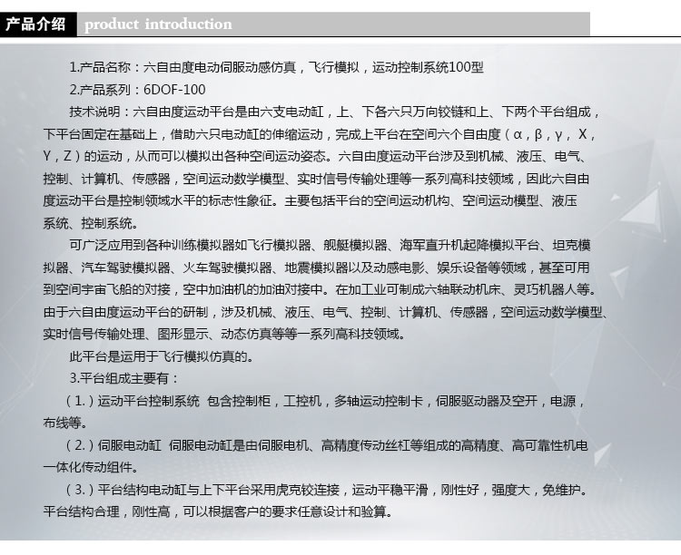 可廣泛應用到各種訓練模擬器如飛行模擬器、艦艇模擬器、海軍直升機起降模擬平臺、坦克模擬器、汽車駕駛模擬器、火車駕駛模擬器、地震模擬器以及動感電影、娛樂設備等領域,甚至可用到空間宇宙飛船的對接,空中加油機的加油對接中。在加工業可制成六軸聯動機床、靈巧機器人等。由于六自由度運動平臺的研制,涉及機械、液壓、電氣、控制、計算機、傳感器,空間運動數學模型、實時信號傳輸處理、圖形顯示、動態仿真等等一系列高科技領域。