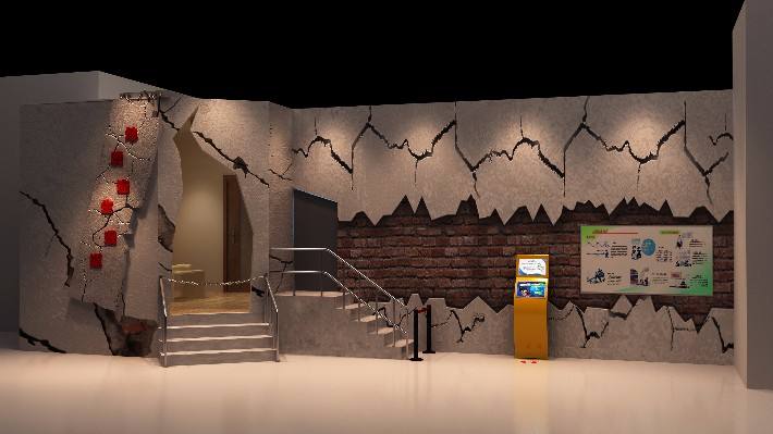 小屋放置在運動平臺上。屋頂和墻壁由鋼結構和木工板等材質混合制成,并在適當的設置地震科普知識宣傳的文字與圖畫。