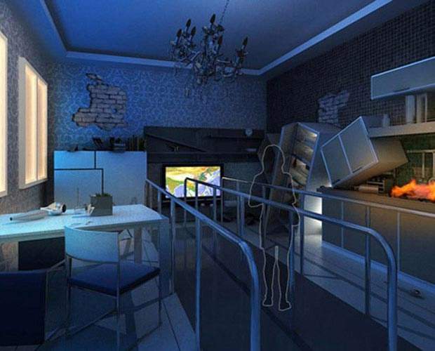 當地震發生時,多用柜里的雜物由于顛簸散落在地板上,餐桌、隨著震動來回晃動、位移,房頂上上吊的燈來回晃動。點燃的煤氣灶正在燒一壺開水,地震發生時,火苗來回攢動,隨時都有可能引燃周圍物體的可能,觀眾應該按提示緊急關門閥門,避免引起火災。電纜斷路,使電燈熄滅,屋內更加昏暗。隨著震動的加劇,房頂上的房梁震下。
