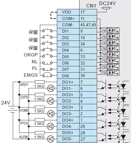 DC24V | 抱閘輸出,接繼電器線圈 | 接外部開關(guān)電源V+ | |